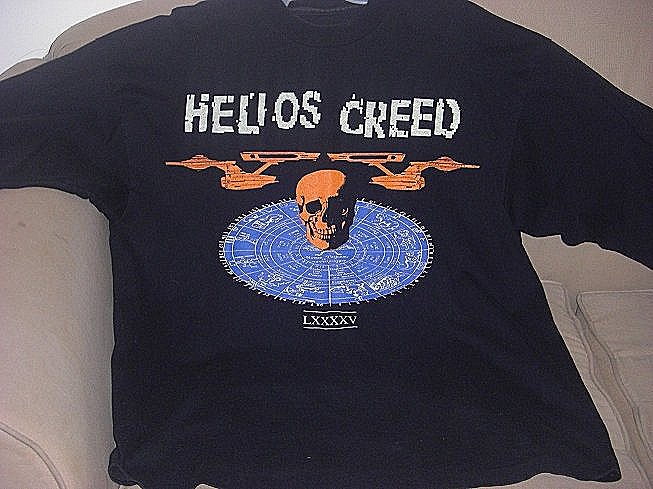 Old Helios Creed T-shirt from the Amphetamine Reptile Records days, circa early 90's. The front of the shirt has the Mayan Calendar on it with a couple of space ships and a skull